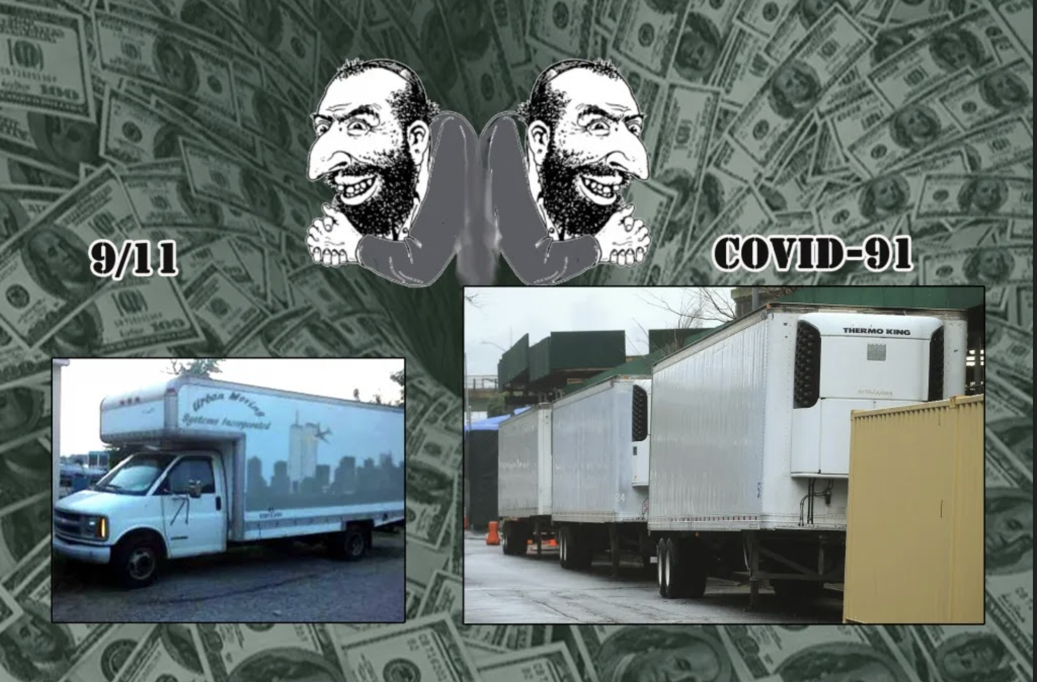 Example of an anti-Semitic internet meme from the website of the Goyim Defense League, a group recently responsible for distributing anti-Semitic fliers in Napa among hundreds of other incidents nationwide. The meme contains a combination of traditional anti-Semitic tropes such as the "smirking merchant" along with the implication that Jews are responsible for the 9/11 attacks and the COVID-19 pandemic