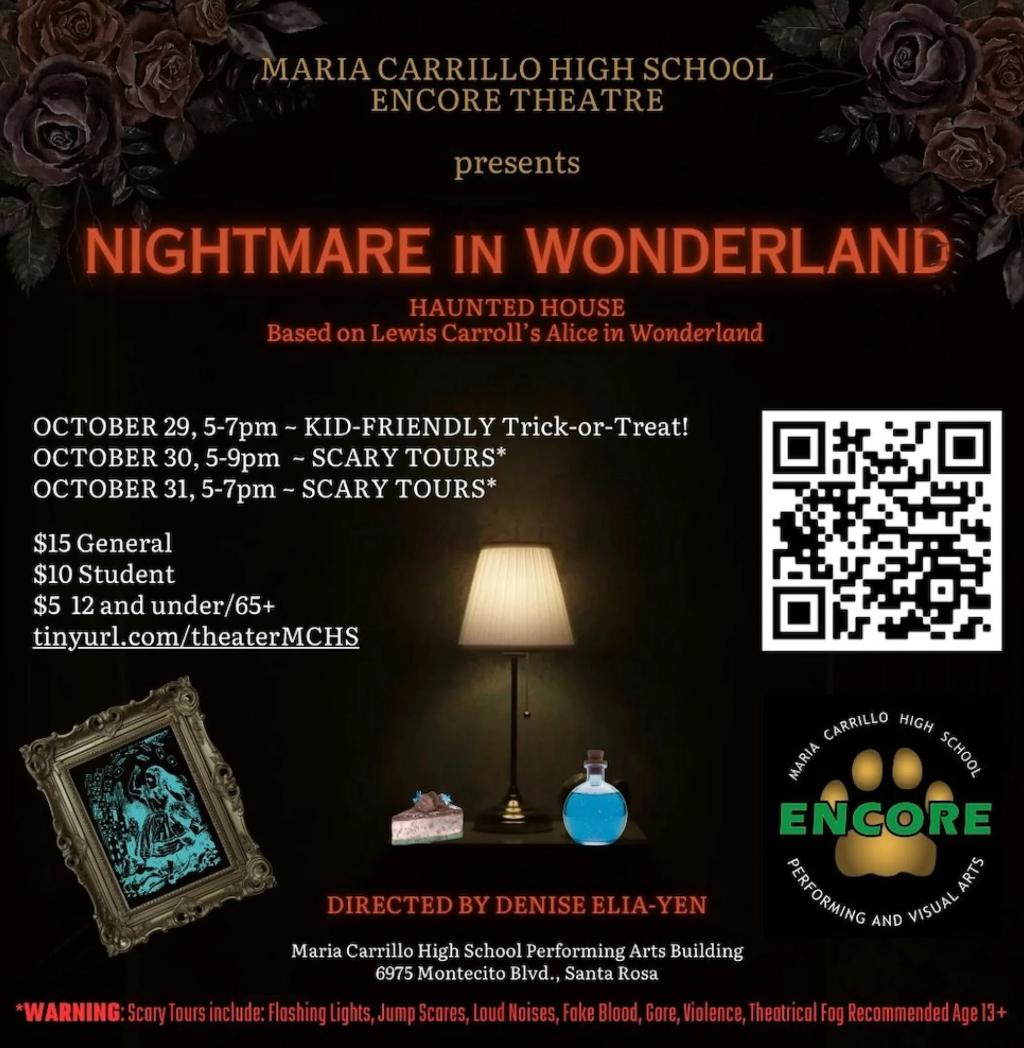 As the bright, sunny skies of summer vacation slowly drift away and get replaced by the eerie chill of an autumn breeze, Halloween is right around the corner. Maria Carrillo High School’s drama department is hard at work, keeping alive the tradition of transforming the theatre into a truly spine-chilling showcase of spooks and spirits. Under the direction of theater and film teacher Denise Elia-Yen, the school’s annual Haunted House returns once again, this time with a darker, more twisted take on the story Alice in Wonderland, promising an enticing experience full of bizarre exhibitions, haunting undertones, and plenty of good old-fashioned frights.